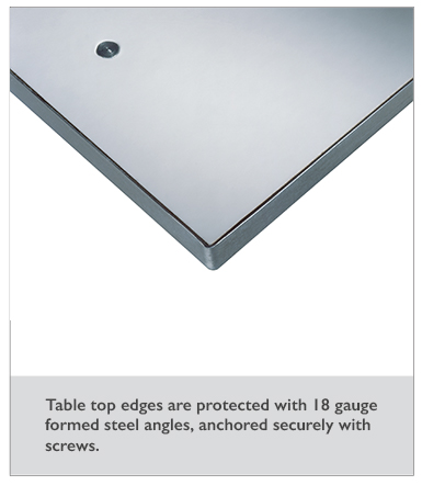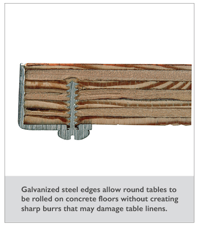 3/4" plywood core with galvanized steel edging provides maximum edge protection on our premium line of banquet tables. Because the steel edging is so tough, it easily stands up to rolling and dragging over concrete floors like no other edging material. Bolted hardwood runners carry the heaviest loads and allow for safe stacking during storage. The time tested, hardened steel braces securely lock the legs in place no matter how often the tables are set up and folded for storage. Our 14-gauge, 1.05" diameter all-welded legs are built to handle the worst punishment that your staff may dish out.